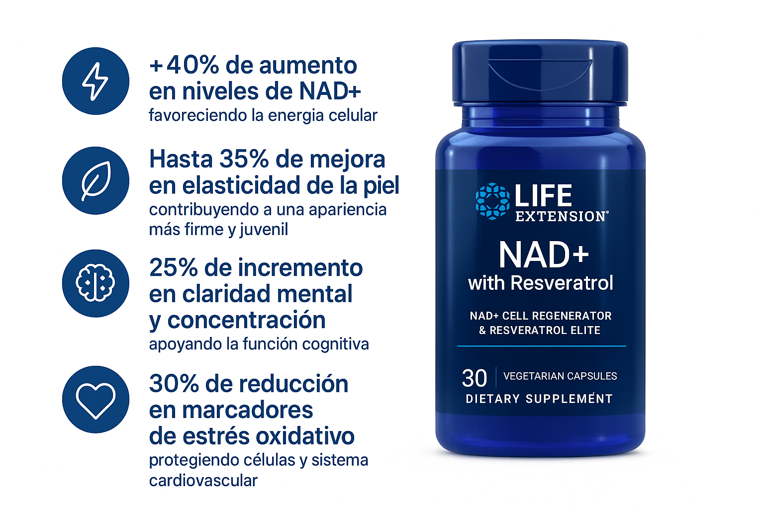 +40% de aumento en niveles de NAD+ en 30 días de suplementación, favoreciendo la energía celular.